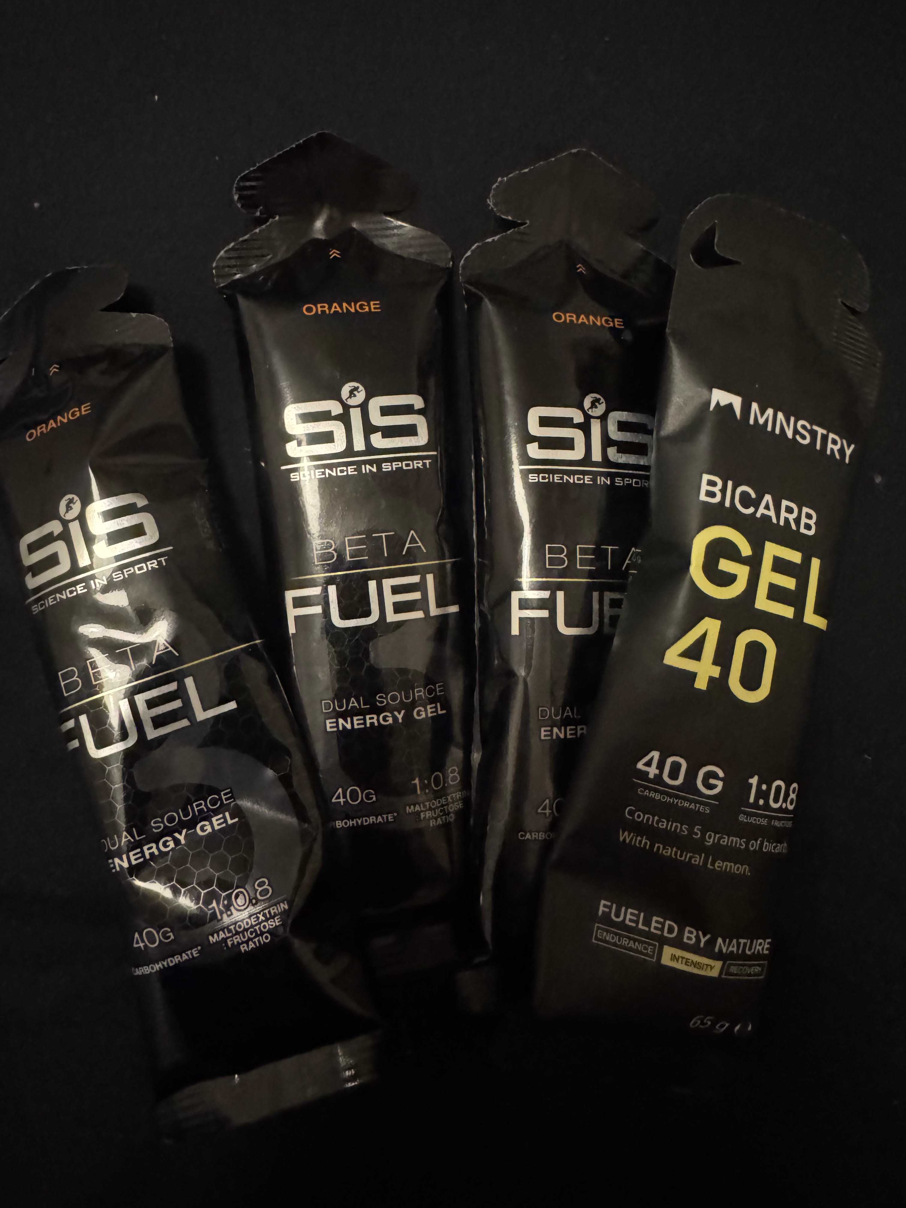 Andris: Pēdējā mēneša laikā mans uzturs intervālu treniņos ir izskatījies identiski. Mnstry Bicarb želeja tieši pirms treniņa un 3x SiS Beta Fuel želejas treniņa laikā. Šie treniņi parasti ir bijuši 60-80 minūtes gari, kas nozīmē, ka jāēd ir bieži un kopējais apjoms sanāk lielāks kā ierasts sacensībās. Tomēr vēders par šādu kombināciju ir sūdzējies maz, un sajūtu ziņā esmu šajos treniņos pārsvarā juties labi. Grūtākais ir pašā sākumā. Mnstry želeja ir negaršīgākā želeja pasaulē. Ja tāda būtu jāēd slodzes laikā, tas man prasītu 10 minūtes, lai tikai viņu dabūtu lejā. Man nepatīk ne garša, ne konsistence. Tomēr man patīk tās sastāvs, kas teorētiski dod iespējas labākam sniegumam treniņā. Vai tā tiešām ir, to neviens šīs konkrētās želejas kontekstā nav vēl pierādījis, jo, lai arī nātrija bikarbonāts (soda) ir pierādīts kā sniegumu uzlabojošs, šīs želejas deva ir krietni zem rekomendējamās devas un, balstoties uz pētījumiem, man vajadzētu apēst kādas 3 šādas želejas, turklāt kādu stundu vai pusotru pirms treniņa (ražotājs gan rekomendē slodzes laikā). Neesmu drošs, ka uz to esmu gatavs. Tomēr, pat ja tas bikarbonāts nenostrādā, es tieku pie 40 gramiem ogļhidrātu. Pēc tam treniņa laikā SiS želejas aiziet grabēdamas. Pēdējā gada laikā šīs želejas ir kļuvušas par mana sacensību uztura plāna stūrakmeni. Man tās ir gan vēlamajā izmērā (40g OH), gan garšā. Es pat, godīgi sakot, ne visai atšķiru zemeņu, apelsīnu vai neitrālo garšu, visas liekas vienādi labas.